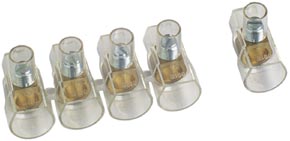 Stecca da 10 morsetti isolati singoli. In policarbonato trasparente, UL94-V2, GWT 850°C. Morsetto ottone CW 614 N. Viti/dadi acciaio zincato.